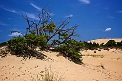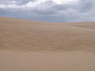 The tall dune area of Jockey's Ridge is known as a medano—a massive, asymmetrical, shifting hill of sand lacking vegetation.[7] The desert-like environment of the dunes makes life difficult here with little to no vegetation or animal life in this area. The notorious winds of the Outer Banks cause a continual shifting of sands on the dunes. Winter's northeastern winds blow stronger than summer's southwestern winds, causing the dunes to move about one to six feet to the southwest each year. The dune is, however, stabilized somewhat by the surrounding maritime forests. Scientists estimate that there are 30 million tons of sand in the park.[7]