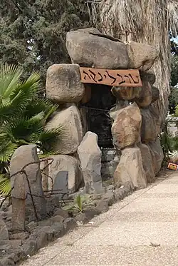The memorial to the victims of Babi Yar, in the shape of three connected stone arches with the name "Babi Yar" spelled out in Hebrew letters (Hebrew: באבי יאר), also commemorates the decimated Jewish communities of Bobruisk, Kovno, and Kiev with small brass plaques at the base of each arch.[19] The memorial was erected over bone fragments from Babi Yar that were reinterred at the cemetery. The bones were brought out of Ukraine by three American college students in July 1971. The memorial was dedicated in 1972 by Israeli Prime Minister Golda Meir.[20] The memorial is the site of an annual memorial ceremony on Yom HaShoah.[21]