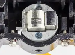 A practical, production-ready design of the Rijckaert – de Niet head for cassette recorders was patented by Niro Nakamichi in November 1981.[f] Fitting two replay sub-channels into 0,6 mm of a cassette track was a challenging task; according to the patent, each of two cores had to be made up of 0.2 mm (0.0079 in) and 0.4 mm (0.016 in) thick lamination stacks; the windings had to be hidden in narrow grooves cut into the sides of the thickest stacks. The patented servo system, which was soon commercialized as the Nakamichi Auto Azimuth Correction (NAAC), analyzed only treble signals in the 2–8 kHz range; the deadband of the control loop was set with a simple diode limiter. The servomechanism was driven by an electric motor and used a complex gear train terminating in a wedge that pushed the pivoting replay head.[24]