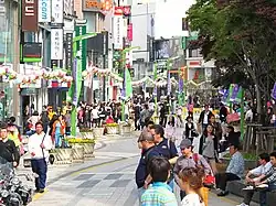 Nampo-dong is a central commercial and shopping area in Busan, South Korea. Nampo-dong is in Jung District ("Central District") in the southern center of the city, bordering the city river on the north side. Served by two bridges connecting Yeongdo District to the south, Nampo-dong is also accessible by Nampo Station subway. The area mainly consists of a long north-to-south street with a large walking area with shops, cafes, restaurants, and statues or other seasonal or permanent exhibits.[1] Side streets also have numerous camera shops, and heading south the streets turn into Kangtong Market[2] ("Tin-can Market") and Gukje Market, with foreign goods and street food, as well as Jagalchi Market, with fresh seafood for sale or dining as the streets approach the harbor. On the north end of Nampo-dong is the new Lotte Department Store. On the west side a narrow elevator leads up to Yongdusan Park with its tower. Nampo Station also has an extensive series of underground shops.