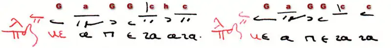 This sticheron could be sung as well by a protopsaltes in the soloistic kalophonic style. If the medial signature of nana was the end of the section chosen for the realisation of a sticheron kalophonikon, this sign could cause, that a whole kratema, a section in abstract syllables like το—το—το for instance, was created in the phthora nana as an echos kratema.[14]