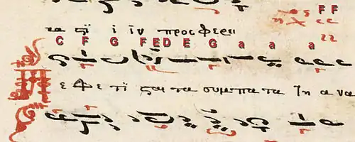 - C νη—D πα—E sharp [βου δίεσις]—F γα, F γα—G δι—a κε—b flat [ζω' ὕφεσις−6], b flat [ζω' ὕφεσις−6]—c νη'—d πα'—e flat [βου' ὕφεσις−6].