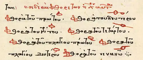 γνωστών σοι δὲ ἔστω καὶ τοῦτο, ὅτι ἡ φθορὰ αὕτη οὐκ ἔχει καθώς ἐστιν ἡ τοῦ πρώτου ἢ τοῦ δευτέρου, ἢ τοῦ τρίτου, ἢ τοῦ τετάρτου, ἤ τοῦ πλαγίου δευτέρου, διότι αἱ τούτων τῶν ἤχων φθοραὶ δεσμοῦσι καὶ λύουσι ταχίον καὶ ποιοῦσιν ἐναλλαγὴν μερικὴν πὸ ἦχον εἰς ἄλλον καὶ ἔχουσι τοῦτο καὶ μόνον.[12]