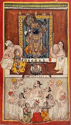 According to regional literature, Nanda is regarded to have organised festivities to celebrate the birth of Krishna. He is described to have invited the people of the region of Vraja to the occasion, including the village headsmen and the married and unmarried women of Vrindavan, notably the gopis. Drummers were invited to play music on the occasion and Brahmanas bathed the deity while chanting mantras. Yashoda is stated to have showered flowers upon the child while Rohini offered a feast to the guests.[3]