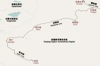 The Southern Xinjiang railway or Nanjiang railway (simplified Chinese: 南疆铁路; traditional Chinese: 南疆鐵路; pinyin: Nánjiāng tiělù), is a railway between Turpan and Kashgar in Xinjiang, China. The railway is 1,446 km (899 mi) in length and runs along the southern slope of the Tian Shan mountain range, connecting all major cities and towns of the Northern Tarim Basin, including Turpan, Hejing, Yanqi, Korla, Luntai (Bügür), Kuqa, Toksu (Xinhe), Aksu, Maralbexi (Bachu), Artux, and Kashgar.[1][2]