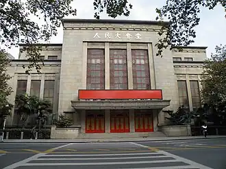 The Nanjing Great Hall of the People[1][2] (Chinese: 南京人民大会堂; pinyin: Nánjing rénmín dàhuìtáng), which serves as the Jiangsu Provincial People's Congress and the National Theatre of Drama and Music and Art Gallery, was built in 1936, and is located at No. 264, Changjiang Road, Xuanwu District, Nanjing, Jiangsu Province, China. The gross floor area being 5,100 square meters, the 4 story hall was built up of reinforced concrete, facing south. Its original name was the National Great Hall (Chinese: 國民大會堂)[3][4] and the hall was renamed in 1949.