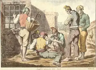 In the Age of Revolution, the Lazzaroni (or Lazzari) of Naples were the poorest of the lower class (Italian lazzaroni or lazzari, singular: lazzarone) in the city and Kingdom of Naples (in present-day Italy). Described as "street people under a chief", they were often depicted as "beggars"—which some actually were, while others subsisted partly by service as messengers, porters, etc.[1] No precise census of them was ever conducted, but contemporaries estimated their total number at around 50,000, and they had a significant role in the social and political life of the city (and of the kingdom of which Naples was the capital). They were prone to act collectively as crowds and mobs and follow the lead of demagogues, often proving formidable in periods of civil unrest and revolution.