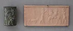 Among the known sons of Naram-Sin were his successor Shar-Kali-Sharri, Nabi-Ulmaš, who was governor of Tutub, and a Ukin-Ulmash. Excavations at Tell Mozan (ancient Urkesh) brought to light a sealing of Tar'am-Agade, a previously unknown daughter of Naram-Sin, who was possibly married to an unidentified endan (ruler) of Urkesh.[34] A recently found cylinder seal, looted from Urasagrig, shows that the governor there, Sharatigubishin, was also a son.[35] Other known children include Enmenana the "zirru priestess of the god Nanna, spouse of the god N[anna], entu priestess of the god Sin at Ur", Šumšani ēntum-priestess of Shamash at Sippar, a son who was governor at Marad, an unnamed daughter who was ēntum-priestesses at Nippur, Bin-kali-šarrē, Lipit-ilē (governor at Marad), Rigmuš-ālsu, Me-Ulmaš, and Ukēn-Ulmaš and a granddaughter Lipus-ia-um.[36][37] One daughter, Tuṭṭanabšum (Tudanapšum), held the position of high priestess of Enlil at Nippur, the most important religious position in the empire. She was also deified, the only female and only non-king to be made a god.[38][39]