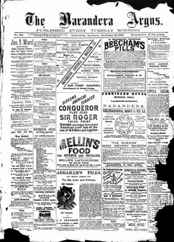 First published in 1880, The Narandera Argus and Riverina Advertiser was published until 1953 when it changed its title to Narrandera Argus, which is still in publication.[1] It was published by James Ashton from 1892 and later by Donald M'Neil Turner.[2] A rival newspaper, the Narrandera Ensign, was established in 1886. This paper promoted protectionism, while the Argus promoted free trade.[3]