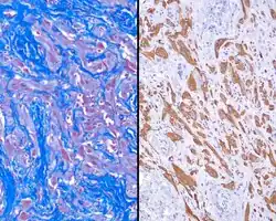 A trichrome stain will highlight the dual components well, with the glial tissue staining red, while the background fibrosis stains a bright blue.[2]