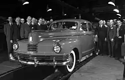 Nash-Kelvinator initiated post-World War II car production on 27 October 1945, shortly after hostilities had ended.[22] This period was characterized by an overwhelming demand for new automobiles, as the existing vehicle fleet was aging and had suffered from neglect due to wartime restrictions on parts and a shortage of skilled mechanics.[23] In response to market demand, Nash, like most other manufacturers, resurrected designs based on its pre-war models. The minimal changes also reflected the ongoing material shortages, retooling challenges, and labor problems that affected the entire automotive industry at the time.[24]