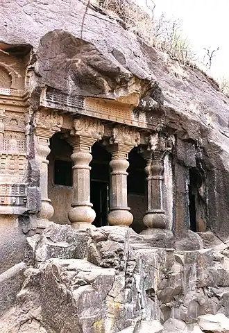 These are a group of twenty-four Hinayana Buddhist caves whose excavation was financed by the local Jain Kings. Cave No. 3 is a large vihara or monastery with some interesting sculptures. Cave No. 10 is also a vihara and almost identical in design to Cave No. 3, but is much older and finer in detail. It is thought to be nearly as old as the Karla Cave near Lonavala. Cave No. 18 is a chaitya worship hall believed to be similar in date to the Karla Caves. It is well sculptured, and its elaborate facade is particularly noteworthy. The cave houses the statues of Buddha, Jain Tirthankara Ṛṣabhadeva, and icons of the Jain yakṣas Maṇibhadra and Ambikā. The interiors of the caves were popular meeting places for the disciples, where sermons were delivered. There are water tanks that have been skilfully carved out of the solid rock.[4]