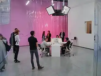 Since 2014, LaBeouf, Rönkkö & Turner have engaged in a number of talks and lectures, including at London College of Fashion, in which LaBeouf read passages from Guy Debord's 1967 Situationist work The Society of the Spectacle,[89][90] and at Radboud University Nijmegen, where they presented a talk on metamodernism via Skype.[91][92] In February 2016, during a performative talk at the Oxford Union, the trio spent 24 hours occupying an elevator (#ELEVATE), engaging with students and members of the public for the duration, and stopping only to give a conventional hour-long talk in the Union debating chamber midway through.[93] Their interactions inside the elevator were simultaneously broadcast inside the debating chamber and online via livestream.[94]