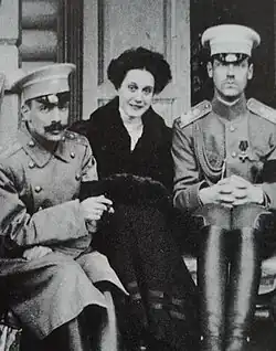 In September 1917, the house arrest was lifted.[77] At the end of the following month the Prime Minister, Alexander Kerensky, was deposed in the October Revolution and the Bolsheviks seized power. With a permit to travel issued by Peter Polotsov, a former army colleague of Michael's who held a command in Saint Petersburg, the family planned to move to the greater safety of Finland.[78] Valuables were packed and the children were moved to an estate south of Gatchina owned by Vladimir Dmitrievich Nabokov, the brother of one of Natalia's closest friends (Nadine Vonlyarlarskaya) and the father of the famous writer, Vladimir Vladimirovich Nabokov. The Bolsheviks discovered their plan, however, and their escape was blocked.[79] The children returned to Gatchina, and they were once again under house arrest.[80] Natalia managed to gain access to her safety deposit box, by claiming that she needed to examine some papers at the bank, and thus retrieved as much of her jewellery as she could conceal without arousing suspicion.[81] The house arrest was lifted in November, but on 7 March 1918 Michael and Nicholas Johnson—who had been his secretary since December 1912[82]—were re-arrested on the orders of Moisei Uritsky, the Head of the Petrograd secret police. They were imprisoned at Bolshevik headquarters in the Smolny Institute.[83]