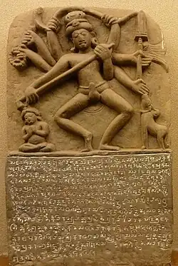 Stone reliefs depicting the classical form of Nataraja are found in numerous cave temples of India, such as at the Ellora Caves (Maharashtra), the Elephanta Caves, and the Badami Caves (Karnataka), by around the 6th century.[17][18] One of the earliest known Nataraja artworks has been found in the archaeological site at Asanapat village in Odisha, which includes an inscription, and is dated to about the 6th century CE.[49] The Asanapat inscription also mentions a Shiva temple in the Saivacaryas kingdom.