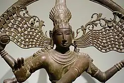 Nataraja (Sanskrit: नटराज, IAST: Naṭarāja; Tamil: நடராஜர், Naṭarājar), also known as Adalvallan (ஆடல்வல்லான், Ādalvallāṉ),[2] is a depiction of Shiva, one of the main deities in Hinduism, as the divine cosmic dancer. His dance is called the tandava.[3][4] The pose and artwork are described in many Hindu texts such as the Tevaram and Thiruvasagam in Tamil and the Amshumadagama and Uttarakamika agama in Sanskrit and the Grantha texts. The dance murti is featured in all major Hindu temples of Shaivism,[5] and is a well-known sculptural symbol in India and popularly used as a symbol of Indian culture,[6][7] as one of the finest illustrations of Hindu art.[8][9] This form is also referred to as Kuththan (கூத்தன், Kūththaṉ), Sabesan (சபேசன், Sabēsaṉ), and Ambalavanan (அம்பலவாணன், Ambalavāṇaṉ) in various Tamil texts.[10][11][12]