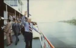 On September 25, 1976, the SS Natchez was used by U.S. President Gerald Ford for a presidential campaign trip to the Southern United States.[5] While on the campaign trip, which was about a month after Ford was nominated for re-election as President of the United States, Ford campaigned from the Natchez during the six-hour Saturday cruise from Lutcher, Louisiana to Jackson Square, New Orleans,[5][6] a historic park in the French Quarter of New Orleans, Louisiana. From there, Ford planned to spend three days in the south appealing to Southern conservatism by depicting his opponent, Jimmy Carter, as a free-spending liberal.[5] To commemorate the event, Doc Hawley, captain of the SS Natchez, gave Ford a black hat with chinstrap and gold thread embroidering the word Natchez.