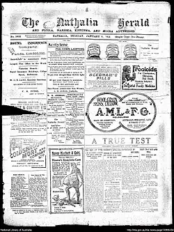Nathalia's first newspaper, the Nathalia Herald and Picola, Narioka, and Moire Advertiser was initiated from Numurkah in 1884.[1] In 1890, Frederick Henry Furze, who had lived most of his life in the district bought the Herald. At the beginning of summer 1899 a fire swept down Blake Street destroying plant and building, a fate every owner dreaded.[1] The Herald was in operation from 1884 until 1975.[2]
