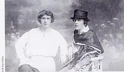 In November 1899, Barney met the poet Pauline Tarn, better known by her pen name Renée Vivien. For Vivien it was love at first sight, while Barney became fascinated with Vivien after hearing her recite one of her poems,[34] which Barney described as "haunted by the desire for death".[35] Their romantic relationship was also a creative exchange that inspired both of them to write. Barney provided a feminist theoretical framework which Vivien explored in her poetry. They adapted the imagery of the Symbolist poets along with the conventions of courtly love to describe love between women, also finding examples of heroic women in history and myth.[36] Sappho was an especially important influence and they studied Greek so as to read the surviving fragments of her poetry in the original. Both wrote plays about her life.[37]