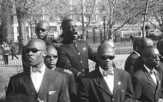 Seeking to restore black manhood,[308] the Nation expresses great concern regarding the emasculation of black men, attributing this attitude to the failure of black men to prevent white men's sexual assault of black women over the centuries.[309] It encourages men to be providers for their family.[310] Women are expected to act as caretakers of the household and the children,[311] and are cautioned against forming friendships with men.[312] Outsiders often perceive the Nation's women as being victims of male oppression and control.[313]