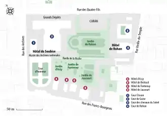 The National Archives has been located since 1808 in a group of buildings comprising the Hôtel de Soubise and the Hôtel de Rohan in the district of Le Marais in the centre of Paris.
