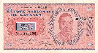 In 1961, a provisional issue of notes was produced by the government. These were overprinted on notes of the Ruanda-Urundi franc in denominations of 5, 10, 20, and 50 francs. On 9 January 1961, regular notes dated 31.10.60 were issued by the Banque Nationale du Katanga in denominations of 10, 20, 50, 100, 500 and 1000 francs. A second series of notes was also issued dated 1962 and 1963 in denominations of 100, 500, and 1000 francs.[3]