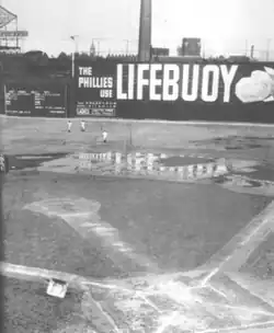 While the Phillies were occasionally at least respectable in the dead-ball era, once the lively ball was introduced the team became less competitive.[33] It was an extremely hitter-friendly park, making it an especially difficult place to pitch. For a number of years, a huge advertising sign on the right field wall read "The Phillies Use Lifebuoy", a popular brand of soap. This led to the oft-reported quip that appended "... and they still stink!" In 1936, a vandal snuck into the Baker Bowl one night and actually wrote that phrase on the Lifebuoy ad.[34] Conventional wisdom ties their failures to the Baker Bowl, but they often finished poorly in Shibe Park as well.