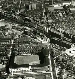 ![]() A 1928 aerial view of Baker Bowl with the soon-to-be-demolished Huntingdon Street station (at right) in Philadelphia | |