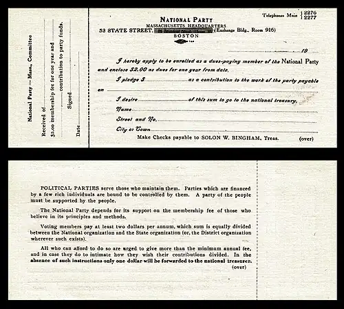 The National Party was funded by annual dues payments by its members, based according to the means of the party member, but of not less than $2 per annum. One dollar of this amount was to be retained by the national organization to fund its operation, while the other dollar was to rebated to the state organization for its own support. Party members were to receive membership cards and a periodic bulletin was planned. Those not wishing to cast their lot with the organization as full members could gain "sympathizer" status through the purchase of an annual button for fifty cents.[1]