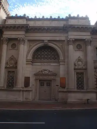 National Valley Bank, also known as United Virginia Bank, is a historic bank building located in Staunton, Virginia. It was built in 1903 and is a one-story, three-bay, Beaux Arts-style building constructed of granite, brick and carved limestone. Its design was based on the Roman Arch of Titus. It features semi-engaged, fluted columns of the Corinthian order flanking the central entrance. The interior features a coffered plaster ceiling. General John Echols (1823-1896) founded the bank in 1865 and served as its first president. His son Edward Echols, who built Oakdene, served as the National Valley Bank's third president from 1905–1915.[3]