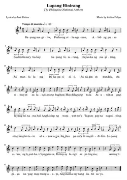 "Lupang Hinirang" ('Chosen Land'), originally titled in Spanish as "Marcha Nacional Filipina" ('Philippine National March'), and also commonly and informally known by its incipit "Bayang Magiliw" ('Beloved Country'), is the national anthem of the Philippines. Its music was composed in 1898 by Julián Felipe, and the lyrics were adopted from the Spanish poem "Filipinas", written by José Palma in 1899.[2]