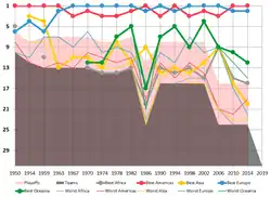 | FIBA Oceania | 0 | 0 | 0 | 0 | 0 | 1 | 1 | 1 | 1 | 2 | 1 | 1 | 1 | 1 | 2 | 2 | 2 | 2 | 2 | TBD |