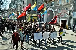 The nationalist party Svoboda had an electoral breakthrough with the 2009 Ternopil Oblast local election, when they obtained 34.69% of the votes and 50 seats out of 120 in the Ternopil Oblast Council.[60] This was the best result for a far-right party in Ukraine's history.[60] In the previous 2006 Ternopil Oblast local election, the party had obtained 4.2% of the votes and 4 seats.[60] In the simultaneous 2006 Ukrainian local elections for the Lviv Oblast Council, it had obtained 5.62% of the votes and 10 seats and 6.69% of the votes and 9 seats in the Lviv City Council.[60] In 1991, Svoboda was founded as the Social-National Party of Ukraine.[61] The party combined radical nationalism and alleged neo-Nazi features.[62] Under Oleh Tyahnybok, it was renamed and rebranded in 2004 as the All-Ukrainian Association Svoboda. Political scientists Olexiy Haran and Alexander J. Motyl contend that Svoboda is radical rather than fascist and they also argue that it has more similarities with far-right movements such as the Tea Party movement than it has with either fascists or neo-Nazis.[63][64] In 2005, Victor Yushchenko appointed Volodymyr Viatrovych head of the Ukrainian security service (SBU) archives. According to professor Per Anders Rudling, this not only allowed Viatrovych to sanitize ultra-nationalist history but also to officially promote its dissemination along with OUN(b) ideology, which is based on "ethnic purity" coupled with anti-Russian, anti-Polish, and antisemitic rhetoric.[65] The extreme right-wing now capitalizes on Yushchenkoist propaganda initiatives.[66] This includes Iuryi Mykhal'chyshyn, an ideologue who proudly confesses that he is a part of the fascist tradition.[67] The autonomous nationalists focus on recruiting young people, participating in violent actions, and advocating "anti-bourgeoism, anti-capitalism, anti-globalism, anti-democratism, anti-liberalism, anti-bureaucratism, anti-dogmatism". Rulig suggested that Ukrainian President Viktor Yanukovych, sworn in on 25 February 2010,[68] "indirectly aided Svoboda" by "granting Svoboda representatives disproportionate attention in the media".[69]