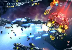 The weapon system is reminiscent of Thunder Force and Axelay;[2][3] There are three types of weapon units in the game the player's ship can acquire by collecting their respective colors via containers dropped by certain enemies when defeated and alternate between each one at any given time during gameplay, ranging from Lichtblitz (blue), Nordwest (red) and Rudel (green).[2] The weapon containers start as bonus points, and shooting them cycles through the three weapon types instead.[2] Collecting the same weapon type upgrades the player's ship with one of two satellite-like options that add firepower. These options can also be switched between back and forth positions by pressing the left shoulder trigger, as well as block incoming enemy shots.[2]