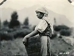 Life in society varies from tribe to tribe and region to region, but some general perspectives of women include that they "value being mothers and rearing healthy families; spiritually, they are considered to be extensions of the Spirit Mother and continuators of their people; socially, they serve as transmitters of cultural knowledge and caretakers of children and relatives."[5] Many Native American tribes believed that they originated from a woman, with many of their legends and creation stories depict a "mother earth."[6] Women were entrusted with overseeing a tribe's agricultural systems, and were responsible for harvesting and cultivating the vegetables and plants for their people. Tribal women like the Algonquians planted their fields meticulously and in a way that kept the land sustainable for future use. After harvesting a tract of land until the soil lacked nutrients to continue, women would be tasked with deciding when and where to clear new fields, allowing the used ones to regenerate.[7] Women in the Haudenosaunee tribes often controlled the distribution of food among their people.[8] Their perceived position as beings of spiritual power gave women in some tribes the opportunity to be healers for minor injuries, as men were more commonly shamans, chiefs, and herbalists.[8]