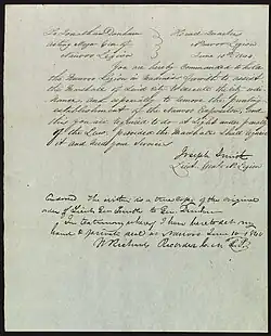 - ^ Military Order to Jonathan Dunham, 10 June 1844, p. 1, The Joseph Smith Papers, accessed June 12, 2024, https://www.josephsmithpapers.org/paper-summary/military-order-to-jonathan-dunham-10-june-1844/1#facts
