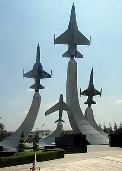 "Fighters on a Stick" at the Royal Air Force Academy grounds. Clockwise starting from the top, an F-16 Fighting Falcon, F-5A Freedom Fighter, F-86 Sabre and F-5E Tiger II.Now at Royal Thai Aviation park, Don Mueang