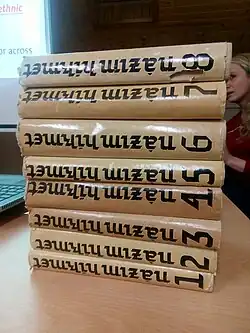 - ^ Nâzım Hikmet. 1967-1972. Bütün eserleri [Collected Works] (8 vols, edited by Ekber Babaef {Babaev}, illustrated by Abidin Dino). Sofia: Narodna prosveta. OCLC Number: 84081921.