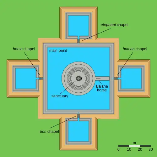 Neak Pean (or Neak Poan) [2] (Khmer: ប្រាសាទនាគព័ន្ធ, "the entwined serpents") at Angkor, Cambodia is an artificial island with a Mahayana Buddhist temple on a circular island in Jayatataka Baray, which was associated with Preah Khan temple, built during the reign of King Jayavarman VII.[3]: 389 It is the "Mebon" of the Preah Khan baray (the "Jayatataka" of the inscription).[4]