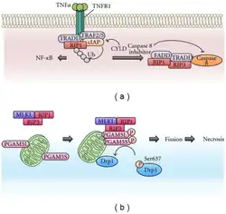 8. ^ a b c Vandenabeele P, Galluzzi L, Vanden Berghe T, Kroemer G (October 2010). "Molecular mechanisms of necroptosis: an ordered cellular explosion". Nature Reviews. Molecular Cell Biology. 11 (10): 700–14. doi:10.1038/nrm2970. PMID 20823910. S2CID 7424865.