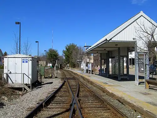 The Needham Heights station building, a gable-roofed wooden structure, was removed in the 1960s. The MBTA bought Penn Central's southside commuter rail assets, including the Needham Line, on January 27, 1973.[2] The station was closed with the rest of the line from October 13, 1979 to October 19, 1987 during Southwest Corridor construction.[2] A mini-high platform was added during the closure, making Needham Heights fully accessible. The mini-high platform was indefinitely closed on September 8, 2022, with a portable lift used for accessibility; it reopened by early November.[6][7]