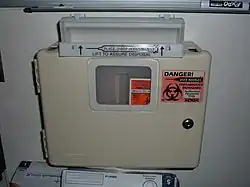 A wall-mounted sharps container