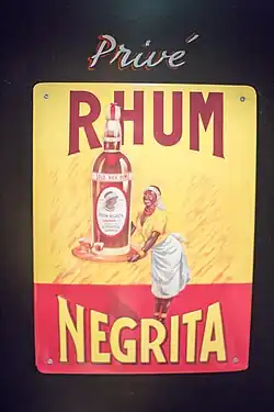 Negrita was first blended and labeled by the Bardinet Company of France in the mid-1800s.[1] It was founded by Paul Bardinet who was a young producer of liqueurs in the French commune of Limoges. He experimented with different blends of tafia to create the new rum.[2] The brand was advertised through billboards with the slogan "el ron de la Negrita" (en. "the rum of the little black girl") with a picture of a Caribbean girl wearing Madras ribbons in her hair. The image became the symbol of the brand and the name was trademarked in 1886.[2]