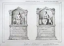 Nehalennia is attested on 28 inscriptions discovered in 1645 in the Dutch town of Domburg on the Zeeland coast, when a storm eroded dunes. The remains of a temple were revealed that was devoted to the previously unattested goddess Nehalennia.[4] Beginning in 1970, numerous altars, remains of female sculptures and related artifacts were found near in the town of Colijnsplaat, including roof tiles and remains of the temple devoted to Nehalennia that was in a former town, now lost. Two other temple remains have been found in the Cologne-Deutz area of what is now Cologne, Germany.[5]