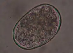 Females of A. caninum release eggs about 65×40 μm in size, which already have 4-10 furrowing stages at deposition. They are oval and thin-shelled and enter the outside world via feces. The prepatency is two to four weeks. The larvae released from the eggs can bore through the skin into a new host (percutaneous infection) or be ingested perorally - mostly via collective hosts such as rodents. As with T. canis, infection of puppies is also possible through the mother's milk (galactogenic infection). Larvae dormant in the mammary gland can be shed over a period of up to three suckling periods after a bitch has been infected once.[19]