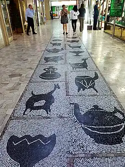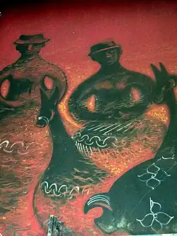 In even worse conditions is Quinchamalí (1958) at the Juan Esteban Montero Gallery: the paint of the mural is peeling and warping due to the humidity. The art restorer Carolina Broschek maintains that the mural can be saved, but the owner of the building on which it is painted, Yusif Tala, opined that the Nemesio Antúnez Foundation should take care of the painting or move it to another place, as has no interest in preserving it.[2] In the same gallery, besides the mural, Antúnez installed floor mosaics which are still in perfect condition.