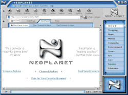 A beta version of a trident shell NeoPlanet was released in October 1997, one month after Internet Explorer 4.0 release. It featured a built-in directory of channels further divided into categories and was for use with Windows 95 and NT. In the fall of 1998 Bigfoot released the NeoPlanet 2.0 version with a new feature of customizable interface. It was positioned as an adjunct to Netscape which it required to run, and as an alternative to Microsoft's and AOL offerings. The new version also featured Snap (a joint-venture between CNET and NBC) and Alexa services incorporated into the browser.[6] The free 1.9MB download was a significant interface upgrade with four skins included and 16 more available on the newly launched NeoPlanet site, while the Microsoft Internet Explorer's underlying features remained unchanged.[7]