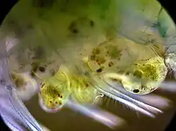On the upper section of the female's body, on the "shoulder", the developing eggs on the ovaries may be seen in more transparent individuals. The color of these eggs will depend on the variety of individual shrimp. The shape of the ovaries curtains across both sides of the shrimp, giving rise to the nickname "saddle". The presence of a "saddle" indicates a female has eggs in her ovaries and may be ready to mate.[5]