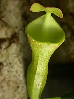 Unlike most other species in the genus, N. campanulata produces only one type of pitcher. As the specific epithet suggests, these are campanulate or bell-shaped. The yellow-green pitchers grow to 10 cm in height[10] and 5.5 cm in diameter. They typically lack fringed wings, instead bearing a pair of ribs running down the front. Inside the pitchers, the glandular region covers only the lowest quarter of the inner surface. The opening or mouth of the pitcher is circular and positioned horizontally. The peristome is greatly reduced and bears a row of tiny teeth. The pitcher lid is elliptic to oblong and has no appendages. An unbranched, 1 mm long spur is inserted at the base of the lid. N. campanulata is wholly glabrous.[6]