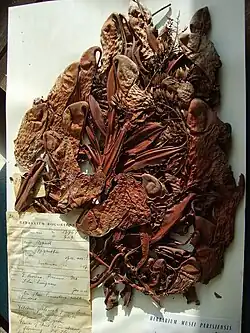 Nepenthes campanulata was described by Shigeo Kurata in 1973 based on a single specimen, Kostermans 13764, deposited at the herbarium of the Singapore Botanic Gardens.[2] An isotype labelled "spec. nov.!" is held at the Museum National d'Histoire Naturelle in Paris. Two more isotypes are deposited at the New York Botanical Garden.[8][9] According to Kurata, the collector stated that the species was endemic to this single location "presumably owing to its habitat which is noted as sand and limestone walls at an altitude of 300 m".[2][3]